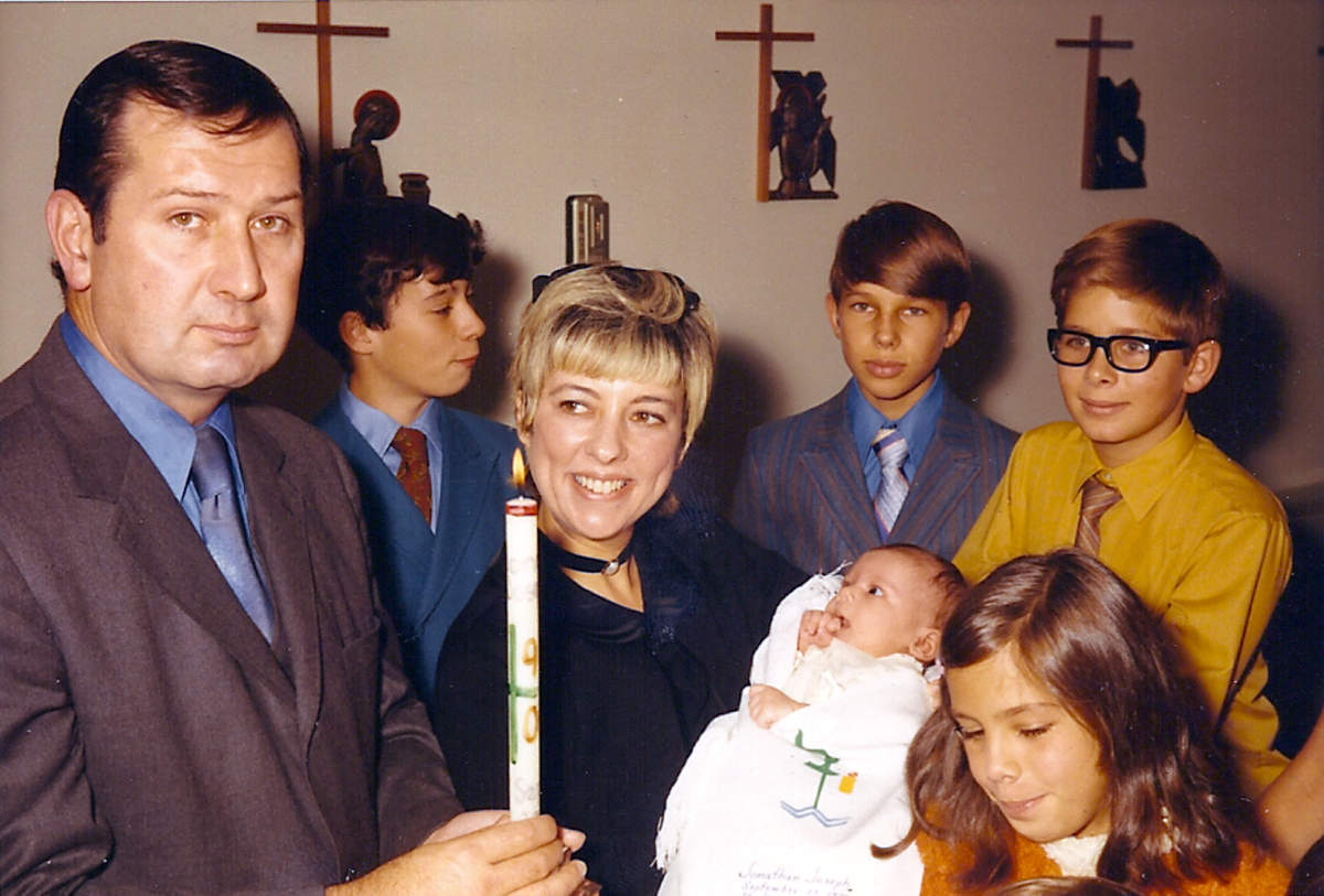 Simone and Larry Peifer, our neighbors and good friends from Walnut Avenue, were sponsors and godparents for Jonathan’s baptism. I don’t remember whether anyone from Minnesota came down at that time. From left to right below is Larry Sr., Larry Jr. and Simone.