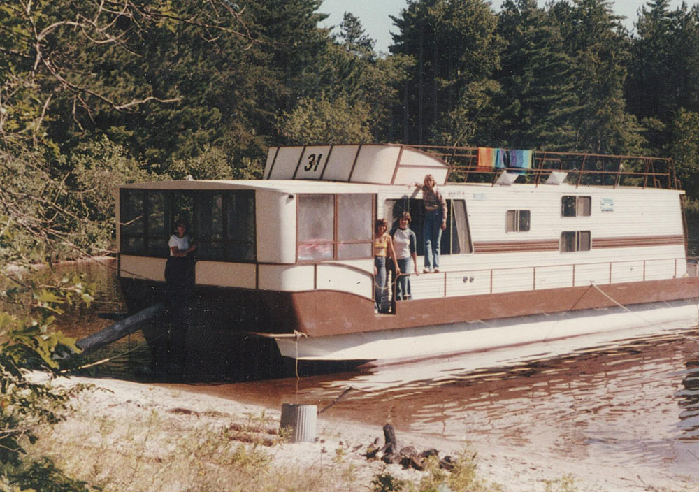 Family Houseboat vacation-In the summer of 1978 we decided to go on a houseboat vacation out of International Falls, MN and on lower Rainy Lake. There were nine of us- Jonathan, Patricia, Karen, Kathy and Russ, Tom and a girlfriend of his, and Sandy and I. For some reason, maybe because he had just started his job with Arthur Andersen, Steve could not make it. We had a big 50’ houseboat that could accommodate all of us, actually ten people. I would be the captain. I thought we would be able to sort of go wherever we wanted and then they gave me a series of very detailed maps that showed the channels we would have to follow, the buoys we would navigate around, the rocks that were just below the surface, etc. This was clearly more involved than I expected. The boat had just about everything you could think of, even a bathroom and shower. They told us we only had xxx number of flushes and therefore we were super conscientious about how many we used and lost count so probably had too many left when we returned. There was also a small refrigerator aboard and a few electric lights. The roof had a lounging area for sunning, etc. There was an open front deck and a rear deck. We had probably two bedrooms with double bunk beds in one of them and in the main living, dinning and kitchen room the sofas converted to beds.
